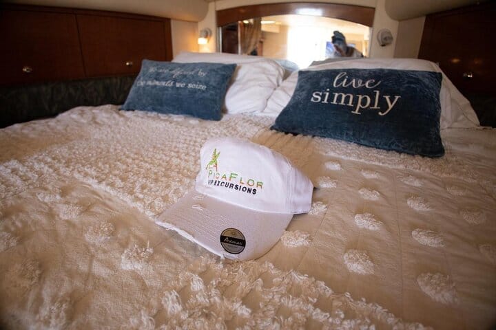 The yatch comes equipped with air conditioner, plasma TV, bathroom, full kitchen, amazing stereo system, wifi, king size bed, two couches, snorkeling equipment, two paddle boards, one 10 ' x 10' platform and much more!!